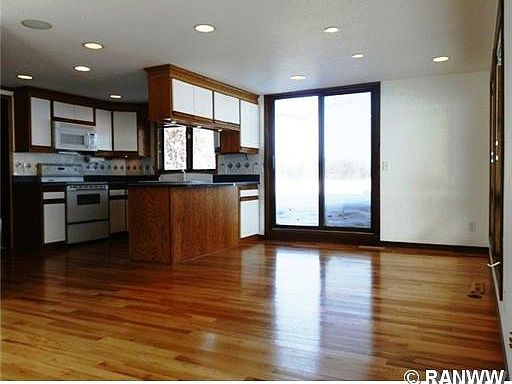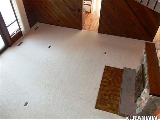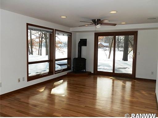 One of the best locations on Rice Lake - a peninsula with low elevation & a sandy shore at the end of a dead-end road! The home has been completely remodeled & offers terrific views from every room, large stone fireplace, family room with wet bar, kitchen with 5x6 pantry with rollout shelves, heated tile floors in bathrooms, custom window blinds, two brick patios, a 26x26 heated attached 2-car garage & an additional oversized 1-car detached garage. New roof in 2011. This is a must see property!