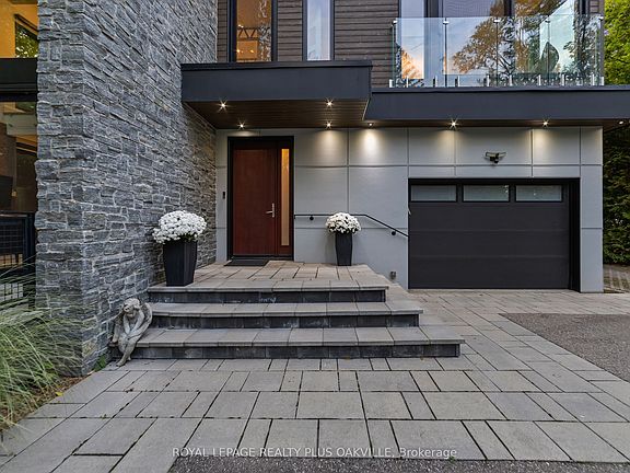 Lakebreeze at 1207 Stirling Drive is a striking contemporary BONE Structure residence by Garrison Creek, where architectural innovation meets refined craftsmanship. Built with a galvanized steel frame and ICF foundation, this high-performance residence offers approx. 5,745 sq. ft. of luxury living on a private 0.34-acre lot at the end of a quiet cul-de-sac south of Lakeshore Road, with partial lake views. The open-concept design features engineered hardwood floors, floating staircases, and floor-to-ceiling tilt-and-turn windows that fill the home with natural light. Exposed structure, a floor-to-ceiling stone hearth, and industrial lighting strike the perfect balance between ultra-modern comfort and cozy living. Picturesque windows flood each space with natural light, framing tranquil views of the surrounding trees and lake. At the heart of the home is a stunning Italian-made MUTI kitchen with a 13-ft quartz island, induction cooktop, built-in stainless appliances & double beverage drawers. Tri-folding glass doors open to a private backyard oasis featuring a heated fiberglass saltwater pool, hot tub, and waterfall feature. The primary suite showcases reclaimed wood accents, Juliet balcony, partial lake views, extensive built-ins, and a spa-inspired 5-pc ensuite with heated towel racks and whirlpool tub. Upstairs also offers three additional bedrooms, 2 full baths & loft with lake views. The lower level features radiant heated polished concrete floors, a recreation/media space, sauna, fifth bedroom, and dual access point staircases. Additional highlights include: motorized shades, skylights, backup generator, in-floor heating, irrigation system, and parking for 8-10 vehicles. Steps to the Waterfront Trail, Appleby College, and Downtown Oakville - a rare blend of innovation, design, and contemporary elegance.