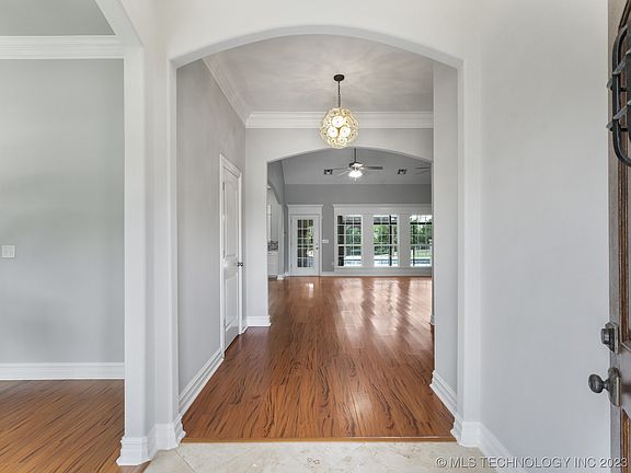 One Level Full Brick Transitional custom home on .57 acre. Open floor plan includes Formal Dining, Study & Game/Theater room. The Great Room features a wood burning stone fireplace, built-ins & oversized windows. Beautiful kitchen with tons of cabinetry, pantry, butlers pantry & a breakfast bar on the huge island. The Master Suite has a bath with a soaking tub, large shower & closet. Private Spa off of the master includes a sauna, steam room, small indoor pool & pool bath. 2 secondary bedrooms (could put the center wall back & have 4 beds total). Four Seasons room off great room with fireplace, hot tub & HVAC. Spacious backyard featuring beach entry salt water Pool, Pergola, Grill area, storage building & basketball area. Brand new Roof in 2023. 4 car tandem main garage has walk up attic/storage. Detached garage has lift & is heated/cooled. Home is situated in Jenks School District on a small private cul-de-sac located near Creek Expressway & Highway 75. Possible lease purchase with 20% down.
