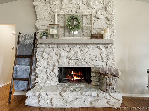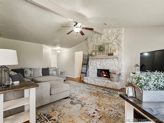 This beautiful Broken Arrow home has been well remodeled and updated and is ready for a new owner. Granite countertops, updated paint and fixtures, SS appliances in kitchen, gas stove, covered back patio, and more! Enjoy the spacious living room with a vaulted and beamed ceiling in front of the large wood burning stone fireplace.