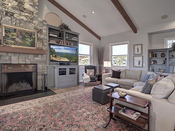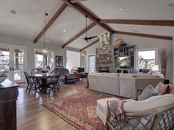 Outstanding Custom Home w/ Views, privacy & beautiful rock outcroppings combined with boastful custom upgraded features. All your primary living is on the 1st level. Large Master suite with beautiful views, large walk- in closet, double vanity and a large walk-in shower, office with plenty of built-ins, great room with exposed wood vaulted ceilings, Rumford wood burning fireplace, built-in bookshelves and cabinets. Flooring is caramelized bamboo and tile. Counters are granite and marble in the bathrooms, Kitchen offers a breakfast bar, coffee bar with sink, Thermador 4 burner gas stove, 2 ovens, warming draw and Bosch Dishwasher, custom built cabinets, large laundry room, green house, commode in the garage, downstairs offers 3 large bedrooms, 3rd is being used as an office, exercise room.
