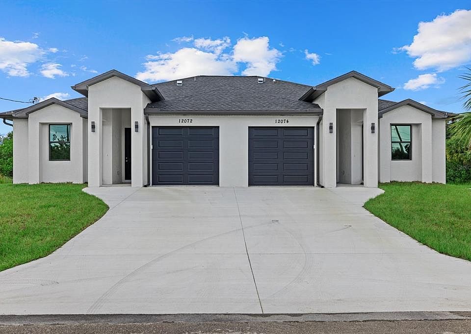 Introducing a newly constructed duplex on an expansive corner lot, featuring an extra-wide driveway, a covered lanai, and impact-resistant windows. The property is serviced by city water and boasts vaulted ceilings in the living room, as well as a generously sized garage offering additional storage space. With numerous premium features throughout, this property presents an exceptional opportunity. Schedule your showing today! There is also an option to purchase two identical duplexes located just down the street, making this an ideal investment opportunity.