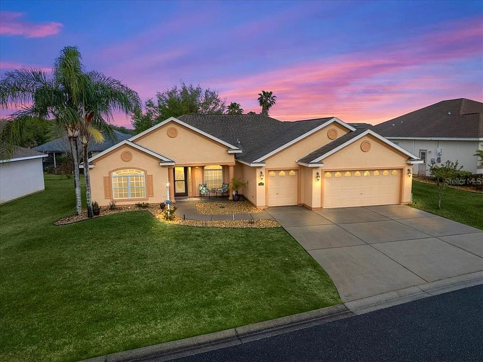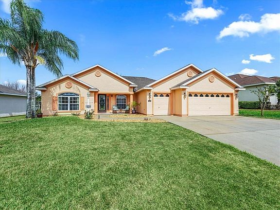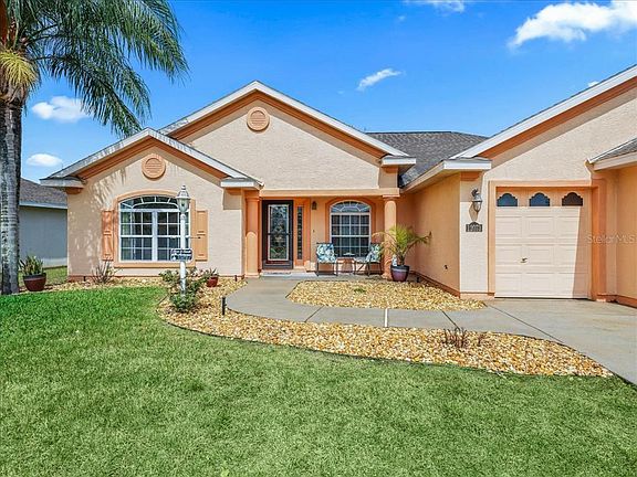 One or more photo(s) has been virtually staged. STONECREST 55 + GATED GOLF COURSE COMMUNITY WITH ALL THE AMENITIES AND 4 POOLS, LOCATED 2 MILES FROM THE VILLAGES BY GOLF CART AS THIS IS A GOLF CART COMMUNITY. ONLY 2 MILES BY GOLF CART TO THE VILLAGES! THE CEDAR MODEL WITH 3 BEDROOMS AND 3 FULL BATHROOMS, TWO CAR GARAGE AND GOLF CART GARAGE. WONDERFUL HOME FOR ENTERTAINING AS YOU HAVE AN EXTRA LONG BREAKFAST BAR WITH SEATING FOR 8 STOOLS, EXTRA CABINETS FOR STORAGE, A WONDERFUL COFFEE/WINE BAR, NEWER FLOORING IN FAMILY ROOM/DEN/OFFICE, NEW A/C IN 2020, SCREENED IN LANAI AND AN ADDITIONAL LARGE CONCRETE PAD OFF LANAI FOR GRILLING. SPLIT BEDROOM PLANS WHICH IS PERFECT FOR GUESTS OR A MOTHER N LAW SUITE, VAULTED CEILING IN LIVING ROOM AND KITCHEN, NORTH EXPOSURE FOR LANAI, CARPET IN BEDROOMS, HIS AND HER VANITY IN MASTER BATHROOM, LARGE MASTER CLOSET AND SLIDING GLASS DOOR OFF MASTER BEDROOM TO LANAI. YOU WLL LOVE THE OPEN CONCEPT OF THIS MODEL. HURRY AS IT WILL NOT LAST LONG!