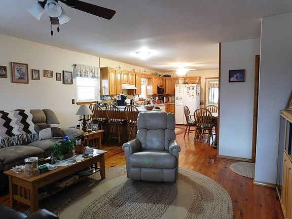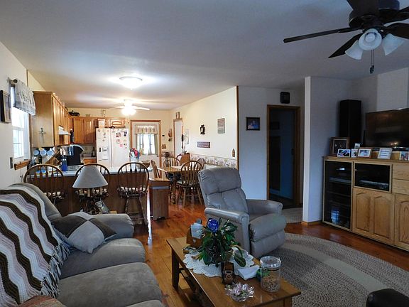 Country home with beautiful pine floors and covered porch on all sides has 4 spacious bedrooms, 2 ½ baths and sets well back off pavement on 12.3 acres m/l. Newer roof, windows and CH&A. and many other updates. Large workshop/ garage has approx. 3200 covered sq ft with 3 roll up doors, insulated, pellet stove and a grease pit. Property is fenced, has a small pond, tornado shelter, garden area, fruit trees, asparagus bed, corral, outbuilding, 4 frost proof hydrants and much more.