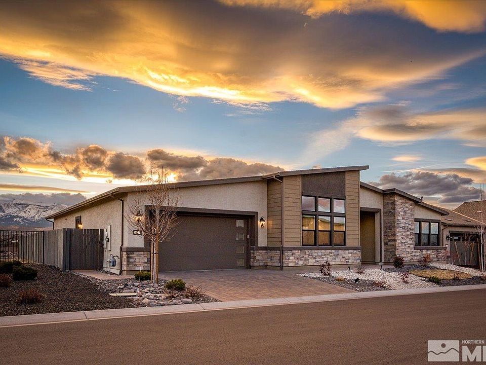 Welcome to luxury living in Reno's vibrant 55+ Regency at Caramella Ranch. Enjoy stunning Sierra mountain & sunset views from this popular Windsong model adjoining common area. With 2748sf of gracious living space and the largest floorplan offered in the community, there are 3 bedrooms w/ private bathrooms, an enclosed office/den, and a spacious great room with a fireplace. An inviting easy maintenance backyard with artificial turf and putting green make this home perfect for relaxation and entertaining., As you step inside, you'll be greeted by an impressive interior courtyard, seamlessly blending indoor and outdoor living spaces. The heart of the home is the expansive great room, overlooking a 60" Primio fireplace with a stack stone surround and an exact fit 75" included TV above. Flowing effortlessly to the covered backyard patio and indoor courtyard, this space is ideal for gathering with loved ones or simply unwinding after a long day. The meticulously landscaped backyard is an oasis of relaxation, featuring easy maintenance artificial turf and a putting green, perfect for leisurely afternoons or entertaining guests. Inside, $127,000 in builder upgrades elevate every corner of this home. A highlight is the thoughtfully selected lighting and low voltage upgrades totaling $60,000, including a whole house speaker system and WiFi boosters for seamless connectivity whether you're working from home or streaming your favorite movies. The gourmet kitchen is a chef's dream, boasting granite counters, rich merlot cabinets, and top-of-the-line Kitchenaid stainless steel appliances, including a 5-burner gas cooktop. A spacious island and large walk-in pantry provide ample storage and prep space, ideal for culinary enthusiasts. The primary suite is a luxurious retreat, featuring a slider for enjoying mountain views and direct access to the backyard. Pamper yourself in the lavish en-suite bathroom, complete with marble counters, bold espresso cabinets, a comfort height dual vanity, walk-in zero clearance shower, and a generous walk-in closet. Don't miss your chance to experience resort-style living in this exceptional home. Discover the epitome of luxury living in Reno's most sought-after 55+ community. Community amenities include the most incredible resort-style clubhouse with indoor & outdoor pools, fitness center, pickle ball, bocce ball, on-going events & activities, & more! Best of all, you can start living this amazing lifestyle today! Why wait?