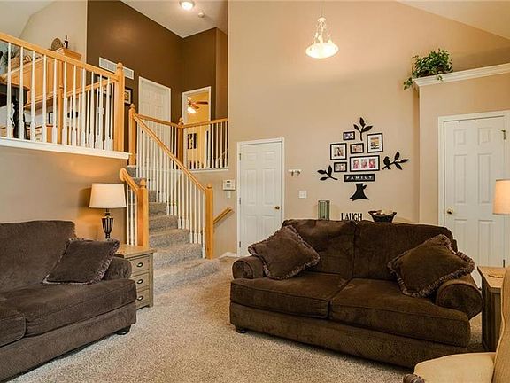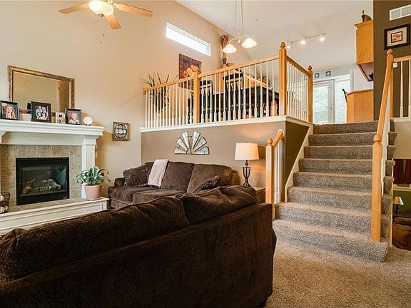This pristine home has a bright and open floorplan with vaulted ceilings throughout. Inviting spacious living room has a gas fireplace. Light filled kitchen features hardwood floors, breakfast bar, desk, pantry and steps out to the back deck overlooking the landscaped back yard. The finished lower level is ideal for watching sports, has a gas fireplace, half bath, & space available for a 4th bedroom. The large master suite offers double vanities, soaker tub and walk-in shower.