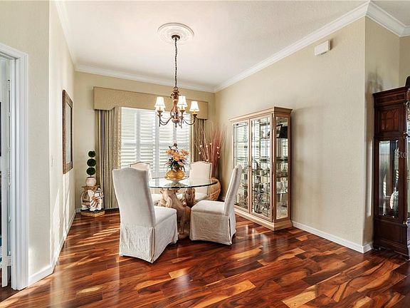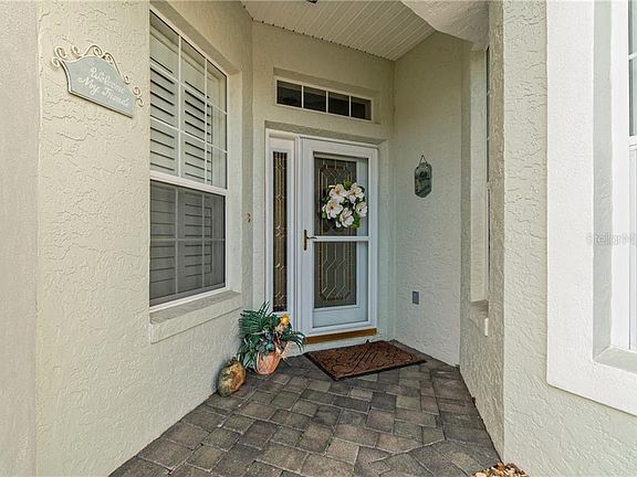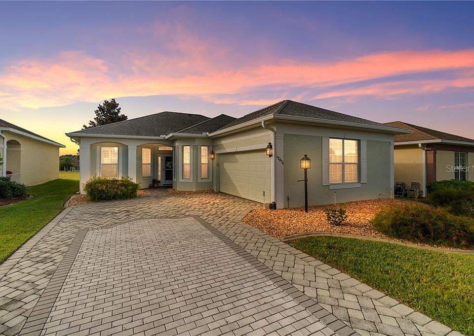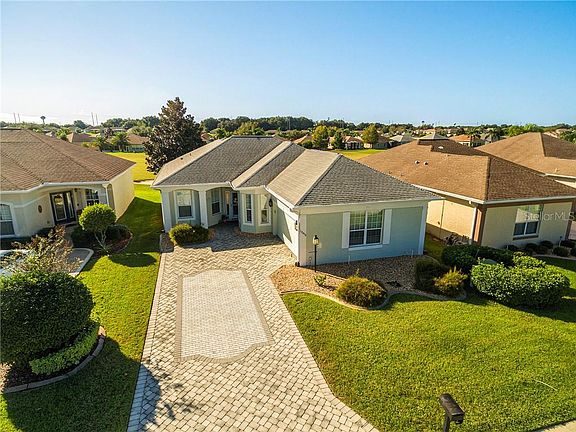 Located is the Exclusive Gated, 55+ Golf Community of STONECREST adjacent to THE VILLAGES, FLORIDA! Beautiful CONCRETE/BLOCK/STUCCO 2 Bdrm + DEN 2Ba home 10' CEILINGS throughout with CROWN MOLDING on the 8th FAIRWAY! Exquisite ENGINEERED HARDWOOD FLOORS, TILE and PLANTATION SHUTTERS throughout! The Kitchen is a Chef's delight with SS appliances, Corian Countertops, 42" Raised Panel Cabinets, Island, Breakfast bar and eat-in Kitchen! Spacious Master Suite with Bay Window, dual sinks, dressing vanity, large walk-in closet, Soaking tub and separate water closet! Den with French Doors! Sliding glass doors off living room lead out to ENCLOSED TILED LANAI! Professionally landscaped yard and driveway adorned with Brick pavers lead up to the impressive Leaded Glass Door. One step through the threshold and you'll know why this home will not be long on the market! Schedule your showing today and start enjoying retirement! Furniture negotiable!
