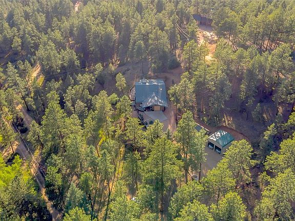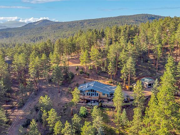Beautiful custom built walkout ranch with direct access, backing to Pike national forest! This home is nestled amongst the pines and sits on 2.9 acres, fire mitigation recently completed by BLM. The main level features an open floor plan w/ lots of natural light and vaulted ceilings in the living room. Wood burning fireplace and beautiful exposed beams complete this lovely relaxing area. The master bedroom has direct access to the deck to enjoy the gorgeous mountain views & it's own private bath. The second bedroom features a murphy bed to maximize the space or convert into a main floor study. Granite countertops, stainless steel appliances and large kitchen island complete the spacious kitchen. Enjoy the large finished basement w/ direct access to the garden beds outside. Full bathroom & bedroom complete the basement area. Store your toys or 2 cars in the HUGE carport & all of your tools, atv, etc in the second outbuilding. Amazing mountain views, quick trail access & solitude await!