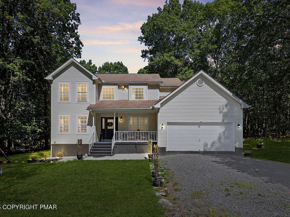 This home delivers what buyers look for: move in ready condition, hardwood floors, updated kitchen, ensuite primary, walk in closet, finished basement, and a two car garage. Recent updates include a brand new HVAC system, new water heater, and all new appliances.Welcome to this 4 bedroom, 2.5 bathroom home in the gated community of Poconos Ranch Lands. With over 2,000 square feet of finished living space, it offers practical features and recent updates that make it an excellent choice for a primary residence or second home in the Poconos. The main level has hardwood floors and a comfortable flow between rooms. The living room features a wood burning fireplace, while the formal dining room is suited for gatherings. A sitting room can be used as a home office or playroom. The eat in kitchen includes brand new stainless steel appliances, ample cabinet space, and room for casual dining. Upstairs, the primary suite includes a walk in closet and private bathroom with a jetted tub, stand up shower, and double sinks. Three additional bedrooms and a full bath complete the second floor. The fully finished basement adds flexible space for a media room, gym, or recreation area. A two car attached garage provides parking and storage. The Poconos Ranch Lands community offers several pools, playgrounds, a clubhouse, horseback riding, tennis and basketball courts, plus trash disposal, road maintenance, gated entry, and 24 hour security. Outdoor recreation is nearby, with ski resorts, lakes, hiking trails, and fishing, making this a true all season location. Combining space, updates, and community amenities, this home is ready for its next owner to move in and enjoy the Pocono lifestyle.