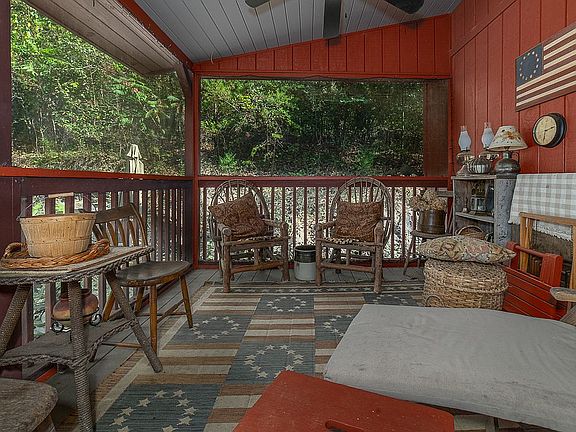 The cabin's screened-in porch, equipped with a ceiling fan, leads to the front door. Inside you'll find a great room with a living area featuring a gas-log fireplace (originally wood-burning) on one end and a kitchen/dining area on the other. A genuine antique country store counter with original shelving and drawers and oak-plank countertop serves as the kitchen's island. Next to the farmhouse sink along the wall, the counter is a marble top from an antique Victorian buffet. The 9-foot ceilings on the first floor feature two hand-hewn antique wood beams from an old log cabin. An oak floor is throughout. Upstairs is one bedroom; the ceiling follows the gambrel roof line and rises to a 9 foot peak. The full bathroom features an antique marble-top vanity and vessel sink, and the washer/dryer hides behind louvered doors. In addition to the stall shower in the bathroom, there's an outdoor hot shower for the adventurous!