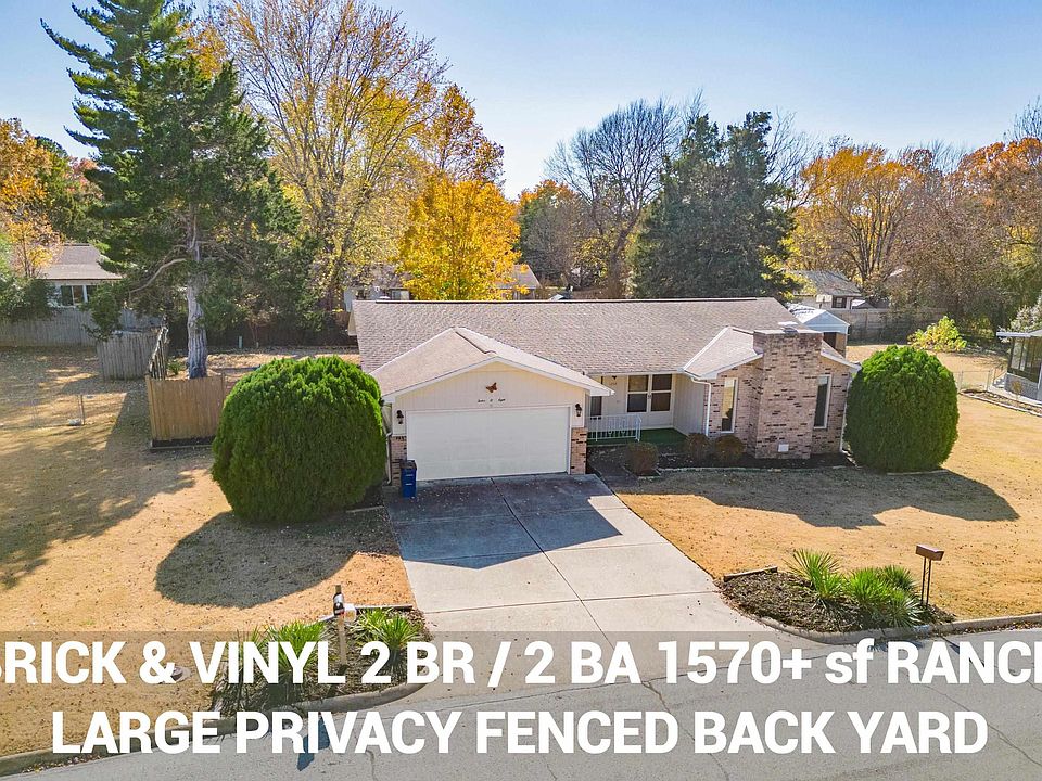 CUTE, CONVENIENT, SURPRISINGLY SPACIOUS 2 BR, 2 BA 1,570+ sf BRICK & VINYL RANCH, CITY UTILITIES, LARGE LOT, PRIVACY FENCED YARD, LOCATED IN THE DESIRABLE INDIAN CREEK NEIGHBORHOOD OF MOUNTAIN HOME. LARGE ROOMS, NATURAL GAS FIREPLACE, COVERED, SCREENED DECK. Covered front porch, elegant double doors opening to spacious foyer & large living room w/vaulted ceilings, brick accent wall & fireplace. Formal dining room could easily be den, office or craft room. There’s plenty of room for dining in the eat-in kitchen w/breakfast bar. Primary bedroom has double closets, private full bath & double windows overlooking the backyard. Spacious  2nd bedroom also has double closets. 2 car garage has long built-in bench, cabinets & shelves. Sliding doors from the kitchen open to covered, screened deck w/steps down to large concrete patio (perfect for pool, hot tub, play set). Peaceful city neighborhood near parks, restaurants, shopping, businesses, medical offices & hospital. Mountain Home Schools.