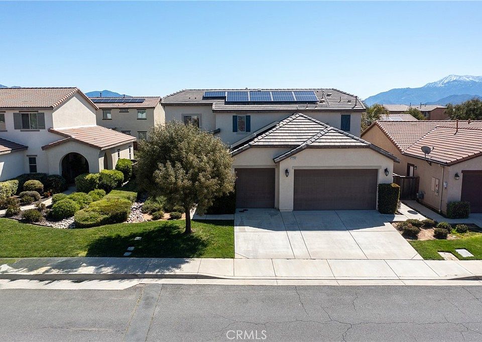 Great opportunity in Beautiful Beaumont! This 4 bedroom 3 bath home is located in highly desirable neighborhood of Sundance and is close to Anna M. Hause Elementary school and local parks. Home features a 3 car garage, 35 solar panels and a good sized back yard with room to play. Floorplan features an open kitchen, dining & living room layout. Living has a custom faux electric fireplace with hearth and mantle along with plantation shutters. Kitchen features a large dining area, island, maple cabinets, granite countertops, walk in pantry and stainless steel appliances with an included refrigerator. Downstairs bedroom, full bath and laundry room that leads to the garage. Upstairs features 3 additional bedrooms with a full hall bathroom with double sinks. Spacious primary suite has a large walk in closet and bathroom with double vanity and separate tub and shower. Backyard has a concrete patio with an aluminum patio cover & 2 ceiling fans to enjoy the outdoors. Come and see!