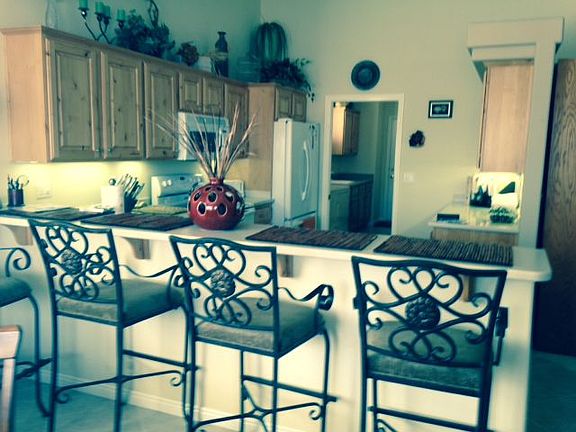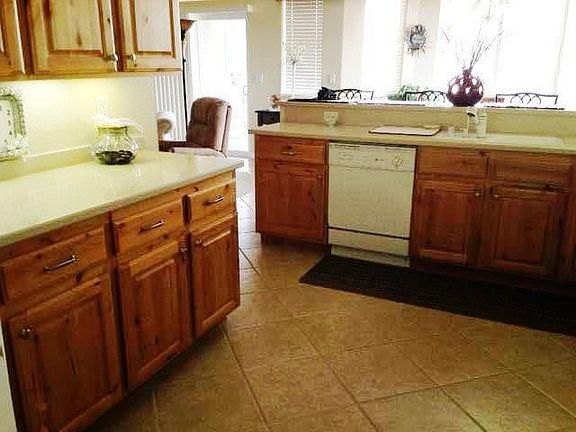 End unit in great location in Summerhills. Beautiful yard backs to Arizona, enjoy the views from your covered patio, living and dining room. This home has open floor plan kitchen with breakfast bar, upgraded cabinets and counters is open to nice size living and dining room. Many other upgrades included, under counter lighting, window sills through out, front door, polywood blinds, solar shades, pocket doors, mirrors & medicine cabinets in both baths, cabinets and sink in laundry plus a pantry. Garage is vented for A/C and heat, built in cabinets, plus free standing bar.