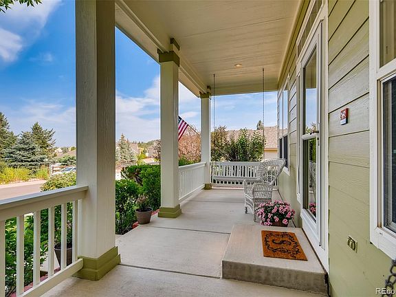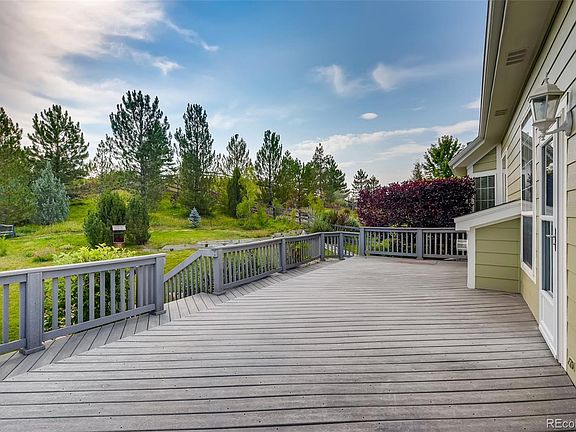 Immaculate, open and vaulted 2-story home with covered front porch complete with two swings! Located on a private .29 acre lot with abundant trees backing to huge undeveloped ranch. Relax and enjoy the Colorado nights and wildlife from your 16 x 32 Trex deck. Entertain in your open and updated kitchen with breakfast nook and center island complete with Brazilian granite counters, custom backsplash and stainless steel appliances. Oversized vaulted family room with gas fireplace adjacent to kitchen allows room for everyone. Main floor study with French doors and custom built-ins set up for working from home. Formal dining room with French doors could easily be a second study, if needed. Main floor master bedroom with bay window, ceiling fan, walk-in closet and updated 5-piece bath. Three additional bedrooms upstairs (two with built-in desks and shelving) plus full bath. Enter home from the oversized attached 2-car garage into the main floor laundry/mud room with utility sink. Hardwood floors, new carpet and crown molding throughout main level. . Partially finished basement with bedroom (has egress window), 3/4 bath and lots of storage. New interior and exterior paint in 2020, plus new roof in 2008.