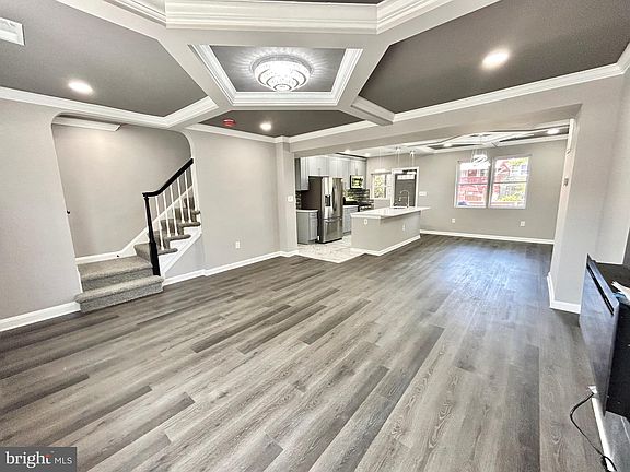 Welcome to this stunningly renovated Baltimore home that you're sure to fall in love with! Step in to the bright open concept main level with countless details from floor to ceiling. You are greeted with the spacious living room highlighting the coffered ceiling detail and elegant lighting. The kitchen is the star of the show with an expansive quartz island, modern finishes, and brand new stainless steel appliances. Off of the kitchen you are able to access the rear deck and yard which is the perfect space to create your own private oasis. Upper level features three carpeted bedrooms and a sleek new bathroom. The well-lit fully finished lower level includes a separate bedroom and new full bath, as well as a laundry area. Basement also includes walkout steps to rear yard. Come experience all the essence this home has to offer!!