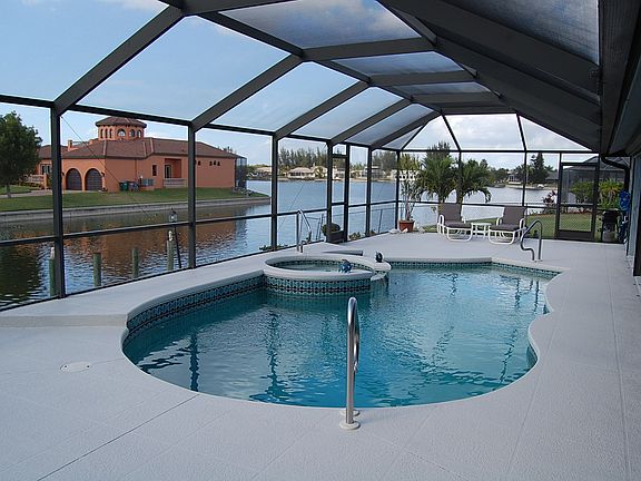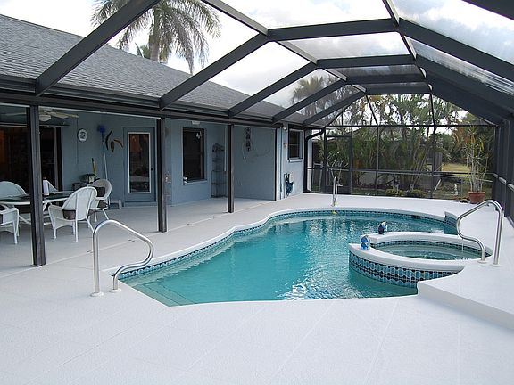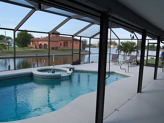 This Beautiful well kept Waterfront Pool Home is located at the opening of Lake Alhambra . Water Views from Every Room. Excellent Fresh Waterfront Location with over 30 Miles of Canals and Access to 7 Lakes for your Boating Enjoyment. HUGE Screened Enclosure spans Entire Rear of Home!! Beautiful Designer Pool with Built in Spa!! Extra Large Master Bedroom with Sliding doors to lead out to the Pool!! Open Kitchen with Granite Tops!! Ceramic Tile in Every Room!! Paver Driveway!! NEW Complete AC System! Generator Panel Switch! Roll Up Hurricane Shutters! City Water and Sewer in and Paid in Full!! This Home has been Meticulously Maintained!! Priced to sell!!