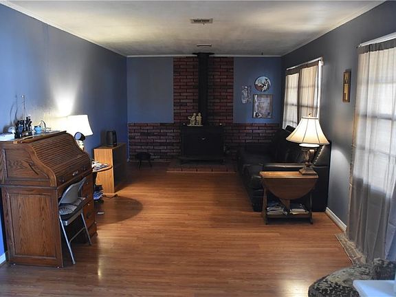 Nice 3 bedroom 2 bath brick home with a 2 car carport, fenced back yard with an out building or shed. Nice size living room with wood burning stove, built in shelving and wood laminate floor. The front two bedrooms are original hard wood floors, and has a bathroom in between. The third bedroom is in the back of the house with its own bathroom. Inside utility, kitchen has electric free standing stove and refrigerator with a dining area also. Would make a great starter home or even an investment property.