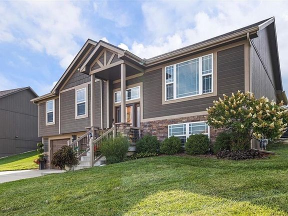 This very popular Kearney home is located in a peaceful cul-de-sac, so much to love. A nice sized family home with 4 bedrooms with 3 full bathrooms, with plenty of natural light to show off the details. The kitchen is inviting, with an open concept and an island for gathering. Stainless steel appliances and granite countertops make the kitchen shine. The Real Hardwood Flooring in the great room is stunning as well. The master suite has double vanities and double closets too.  A favorite for sure is the covered deck overlooking a great backyard that is surrounded by a nice privacy fence and a double-wide gate for easy access. You and your pets will love this outdoor space. The finished lower level boasts a second family room, including a 4th bedroom and private bath for guests or office. Access out through the oversized garage. This is the complete package at a great price. Located a few blocks from the golf course, highway, and plenty of shops and restaurants. This gently lived-in, well-loved home is ready for a new family. Too many updates to list. This home is a must-see and you will be glad you did!