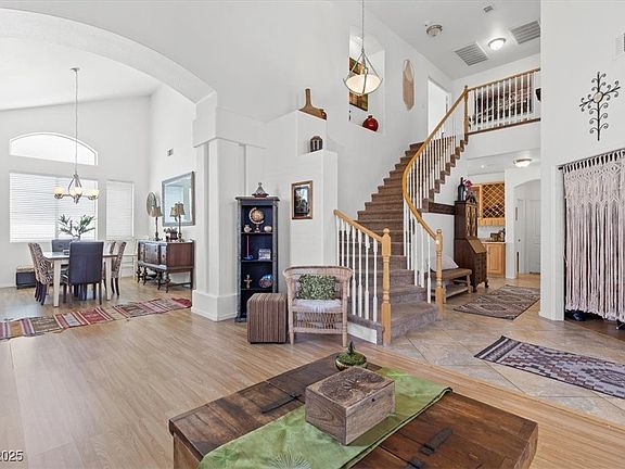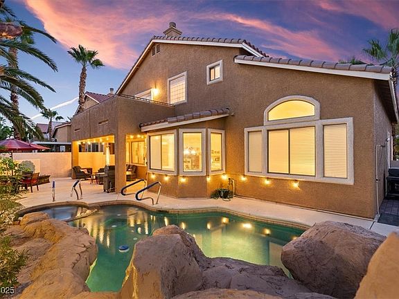 Welcome to your Summerlin oasis with mountain sunsets out front and dazzling Strip views from the primary suite & balcony. This well-maintained home features a grand vaulted entry with formal living & dining rooms plus a versatile office/den. The chef’s kitchen boasts dual ovens, abundant cabinetry, pantry and coffee station, opening to a family room with fireplace and wet bar—perfect for entertaining. A downstairs en-suite bedroom with a luxury Toto smart toilet is ideal for guests or multi-gen living. Upstairs, the primary suite offers vaulted ceilings, dual fireplace, spa bath, walk-in closet and balcony views. Two additional bedrooms, full guest bath and a large extra room complete the space. Outside, enjoy a resort-style backyard with heated pool & spa, gas firepit, plumbed natural gas grill line, outdoor shower, sunning section and shaded lounge. Updates include new water heater (1 yr), HVAC repairs with new AC motor, dual units, roof repair, xeriscaping, and ext/int paint.