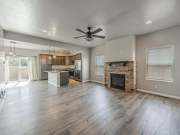 Discover Montrose living in a Wilson Peak model home built by Ridgeline Homes in 2022. Nestled in the Bear Creek subdivision with rows of mature trees upon the entrance, leading to a beautifully manicured park featuring a private pond. Step inside this meticulously maintained 1,894 square foot home with 4 bedrooms and 2.5 bathrooms with granite counters. Grey laminate flooring throughout the home and tiled bathrooms. The living room features vaulted ceilings boasts a stunning stone fireplace, creating a cozy focal point for gatherings. Updated light fixtures and convenient powder room on the main level for guests. The open kitchen features a tile backsplash, spacious granite countertops, center island, stainless steel appliances and maple slate soft-close drawers and cabinets. Enjoy the seamless flow from the dining room into the fully landscaped and fenced backyard backing up to the arroyo, providing a private oasis for outdoor relaxation and San Juan Mountain views. The primary suite, conveniently located on the main level, offers a tiled walk-in shower with glass doors, dual sinks, and a spacious walk-in closet. The additional bathroom and 3 guest bedrooms are located upstairs, each with their own walk-in closets. Separate thermostat to keep the 2nd level at a comfortable temperature. The South guest bedroom offers views of the San Juan mountain range. Additional features include a tankless water heater for efficiency, large closet under the stairs, and a spacious 2-car garage providing plenty of storage space. Don't miss the opportunity to make this spacious Bear Creek home yours. Schedule your private tour today and envision the Montrose lifestyle.