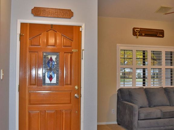 Beautifully landscaped front yard with mature shade tree and covered front patio. Tiled entryway with chandelier. Formal living room with ceiling fan, plantation shutters & built-in bookcases. Great room where kitchen features granite countertops, recessed lighting, plantation shutters, SS appliances, breakfast bar, walk-in pantry with glass door & beautiful mural at ceiling. Tiled dining area with lighted chandelier. Large family room features french doors with enclosed blinds to rear patio, ceiling fan, plantation shutters & stone fireplace. Indoor laundry room with mud sink & cabinetry. Hall bathroom features dual sinks, granite vanity top, skylight & tiled shower surround with tub. Guest bedrooms have carpet flooring, plantation shutters & ceiling fans. Master bedroom suite features carpet flooring, walk-in closet, plantation shutters & french door to rear patio. Master bathroom has dual vanities with granite countertops & walk-in tiled shower. Surround sound. Spacious rear covered patio with ceiling fans. Rear yard has been tastefully landscaped with a firepit, water feature, lawn & plants. Fenced custom pool with spa. Rear block wall. Leased solar. Dual cooling. Must see!