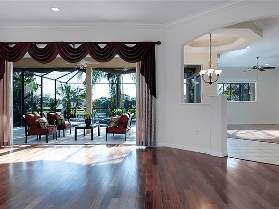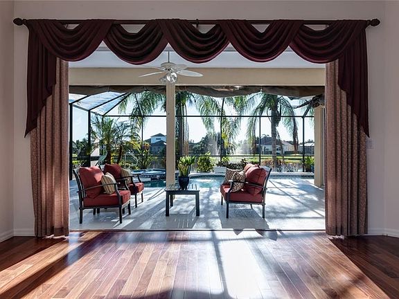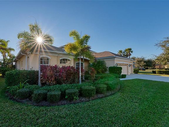 The moment you enter this 3 bedroom 3 bath plus office home, you'll see breathtaking panoramic views of the pool and spa and, just beyond, a tranquil palm-surronded pond which reflects the sky and provides ideal sunset vistas. This Aspen IV Home by Towne model has been expanded 4 feet from covered entry through living room to lanai, providing ample indoor-outdoor living space. The Santos Mahogany hardwood flooring through the living area maintains its excellent sheen and does not require special care. The centrally-placed kitchen features many upgrades including a custom designed super-sized center unit with slide-out drawers, a breakfast bar, and is ideal for entertaining. The home has a large master bath with plantation shutters, separate bathrooms for each bedroom, a formal dining area, a breakfast nook with lanai-facing bay window. A gas pool heater was newly installed for the custom-tiled swimming pool and spa. The lanai features reinforced pet-protected screening and can be accessed from both living areas, master suite, and office (possible fourth bedroom.) The house is equipped with hurricane shutters, an emergency generator, and a spacious 3 car garage. Greyhawk Landing ammenities include community pool fitness area, nature trails, a tennis court, and sports fields. A great location convenient to Sarasota, Clearwater, and Tampa airports awaits you.