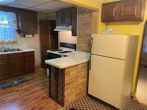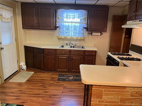 Adorable 2 bedroom home! This home has been well maintained + Mrs. Clean lived here! Pleasant, nice sized kitchen includes a gas stove and the refrigerator. Separate but open dining room has a built in hutch. Large, bright living room. There are 2 generously sized bedrooms with ample closet space. Bathroom is updated with a walk-in shower. Home has updated windows, roof, water tank and electric. Front porch overlooks the woods. Rear covered patio is accessible from the kitchen, a perfect place for you grill. You won't mind doing your laundry in this clean basement, equipped with a washer and dryer.