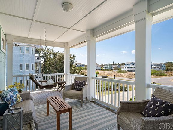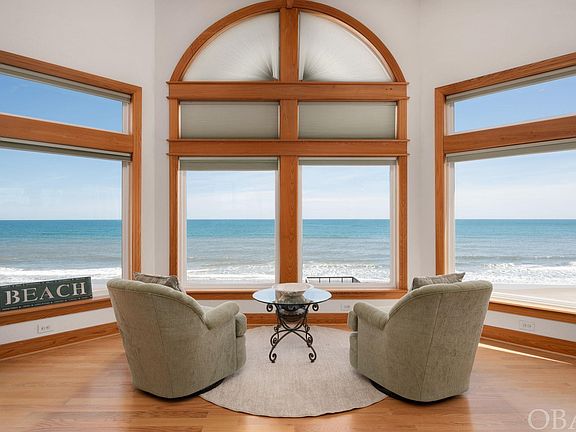 This beautiful custom oceanfront home is designed to maximize ocean, beach & lighthouse views. Located in Ocean Hill with the largest lots & setbacks in Corolla. Ocean Hill’s paved private roads protect owners from on-street parking. Ocean Hill’s restrictive covenants protect one from 9+ bedroom mini hotels being built, like in other areas. An ideal place for homeowners & guests. With just over 5,000 SF of air-conditioned floor space, the dining & sleeping areas accommodate up to 14 guests comfortably. You enter the home from the spacious covered front porch, complete with double swing and sitting area. The entry door opens to a large oak-floored family room. Four large windows provide your first views of the wide dune and the ocean beyond. This large family room serves as a daytime game room & Dolby Atmos surround-sound theater after dark. Ascending the open staircase to the top level reveals the great room with spectacular panoramic ocean views of the full coast from north to south. The great room’s granite fireplace surround and oak mantle are framed by custom oak shelving & second surround-sound video system. The open floor plan flows to a large dining area with views of the Ocean & Currituck Lighthouse. This is adjacent to the spacious modern kitchen with cook island that opens to the lighthouse deck for outdoor grilling & dining with sunset & lighthouse views. The great room also opens to a large oceanside deck to watch the sunrise. The upper-level owner suite has two sitting areas: one in front of four large oceanfront windows, for enjoying the ever-changing views of sea and sky; the second faces the fireplace & TV for a relaxing private evening. This suite features two walk-in closets/dressing rooms & a large custom tiled bathroom with spacious shower area & a separate heated Jacuzzi tub. The well-lit area features two vanities & a hidden laundry chute. The mid-level offers separate accommodations. To the north is a large king bedroom with sitting area & ensuite bath. Next is a four-bed bunk room. The north side also has a combined laundry/ craft room with desk area, built-in cabinets, full sink & closet storage. The south side has an oceanfront king bed suite with walk-in closet & Jacuzzi tub; plus ocean views & deck access. The mid-level deck has a large hot tub & a shaded hammock with ocean & Lighthouse views. Across the hall is a queen bed suite that opens to a covered front porch with porch swing & seating with great sunset & lighthouse views. The first level as an extended family suite, is currently used as an office. It features a king sofa bed, office table, ensuite bath and mini kitchen with fridge & wet bar. The enclosed garage area has room for two cars, plus a large play area & a work/ storage room. An elevator allows easy access from these areas to both the mid & upper levels. All floors have deck access to a walkway over the dune and stairs to the beach. The large beach deck is great for entertaining or relaxing off the sand. There is even room for a swimming pool within the CAMA guidelines if desired. After a day on the beach or a night in the hot tub you can rinse off using the walkway shower or the two private outside hot and cold showers. The nicely landscaped front yard is perfect for lawn games. Below the lawn, the septic system can be expanded to the Ocean Hill 8-bedroom limit. The driveway & garage has parking for at least 8 cars. This home was built to last. The home’s foundation is secured by more than 40 telephone pole pilings extending 20 feet below ground. In 2010 an expansion & remodel for full-time residency was done; including total upgrade of plumbing, HVAC systems, windows, roof, decks, siding, interior floors, finishes & appliances. The home exterior was painted in 2021 and it has been very well maintained by the resident owner. Projected 2024 rental Income Advertised Rates: $162,932; w added Private Pool: $229 ,019. With 8 Bedrooms: Projection is $277,767.