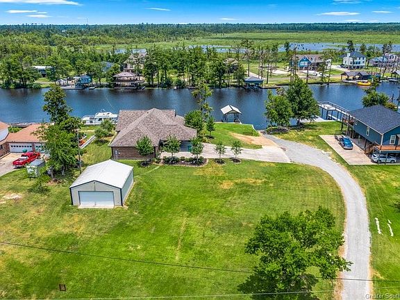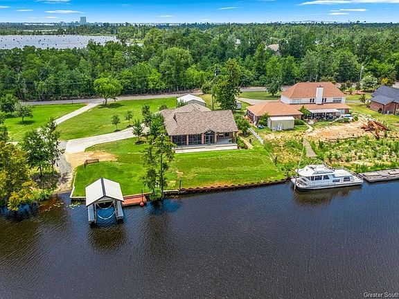 Must see this stunning 7 year old custom waterfront home that is situated on a high bank of the Calcasieu River on a beautiful lot with 180+ ft of frontage with deep navigable water access right from your backyard. This amazing 3 bedroom 2 bath home offers a spacious open floorplan with breathtaking views of the river and surrounding natural beauty that can be enjoyed from most rooms of the home. The large great room with gas fireplace provides plenty of room for entertaining and relaxation and the cathedral ceilings create an impressive and open feel, while the floor to ceiling windows flood the space with natural light, providing a warm and inviting atmosphere. You will want to spend all your free time on the huge screened in back porch with outdoor kitchen area, which is the perfect outdoor space for entertaining family and friends or just relaxing on a starry night. The gourmet kitchen has abundance of stained custom cabinets with a Bosch appliances including a 5 burner gas stove, Bosch dishwasher, wall oven, large walk-in pantry & oversized eat-in island. The master suite is a luxurious oasis with a spa like bath featuring deep air jetted soaking tub, custom tile shower and huge walk-in closet with lots of built-is. All bedrooms are roomy with large closets. Spacious laundry room w/sink and lots of storage. The property has been immaculately maintained and beautifully landscaped and there is a large backyard that leads down to the waterfront area with a boat house, boat launch and wood dock. There is also a irrigation system for yard and landscaping & 26 x 30 metal workshop with electric roll up doors. This home is a boat lovers dream! Move in ready and has a new roof. Whether you are an avid boater or simply looking for for a serene retreat, this home has everything you need. Located in flood zone X and AE but this home is has a very high elevation and has never flooded. The current flood insurance is $636 year and seller will transfer to new buyer. Seller will give allowance to repair bulkhead.
