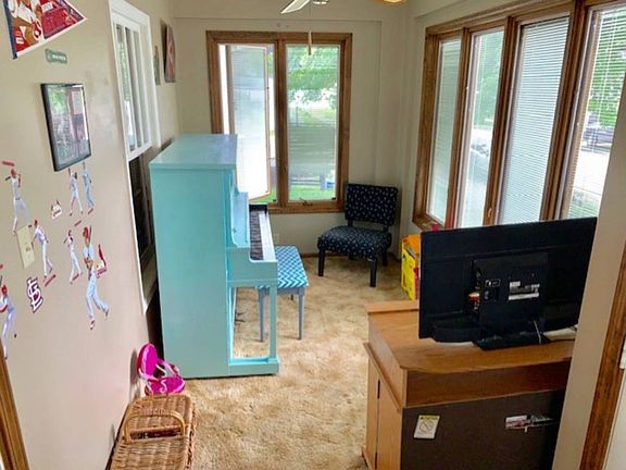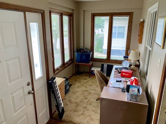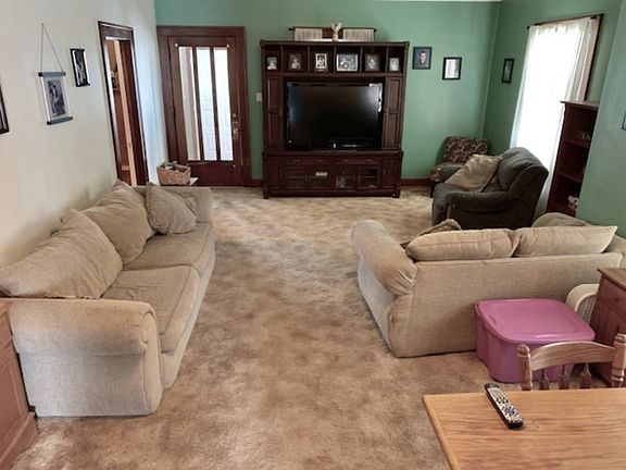 Entrance: Large enough for your office on just one side. Living Room: Nice large room, dining on other end. Freshly painted walls and light beige carpet. Kitchen: Range, refrigerator, microwave stay. Vinyl flooring. Cabinets are wood and painted, grey countertops Bedroom: Nice size room large enough for a queen size bed. Beige carpet. Freshly painted walls. Bedroom: Pretty pink painted walls; beige carpet plus carpet. Bath: Large tub and shower combo, oak vanity. Storage for towels and linens are in a built in closet in the halls. This home features are dry deep basement where the laundry area, pool table and storage. Plus could be a extra bedroom area. The attic has a nice stairway that also could become extra rooms. There is a covered patio out the back with a 2 stall garage. Water heater is 5 years old. New roof in 2013