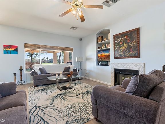 Located on the 13th Fairway, boasting breathtaking views of the Golf Course and majestic mountains. Step into this elegant haven spanning 1807 sqft., with 2 bedrooms, 2 baths, and a den, this home offers ample space for relaxation and entertainment. Wood-burning fireplace in the living room, ceiling fans in every room, man-made laminated flooring and tile throughout. This turnkey property includes all appliances and furnishings - an invitation to simply unpack and unwind amidst its stylish ambiance. The kitchen has a breakfast bar for casual dining, tile countertops and a convenient pantry. Retreat to tranquility in the primary bedroom suite featuring sliding doors that lead out to the serene backyard oasis with a covered patio full length of the back. Primary bathroom with double sinks, a separate tub and shower, and an expansive walk-in closet offering ample storage space for your personal treasures. The 3 car finished garage 23ft and 29ft, deep, room for your car and toys.