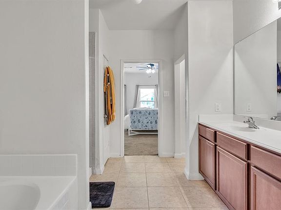 The primary suite is conveniently located downstairs and features a large walk-in closet, double sinks, a soaking tub, and a separate shower, creating a true retreat. Upstairs, you'll find generously sized secondary bedrooms with large closets.