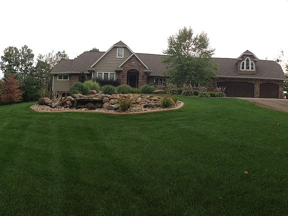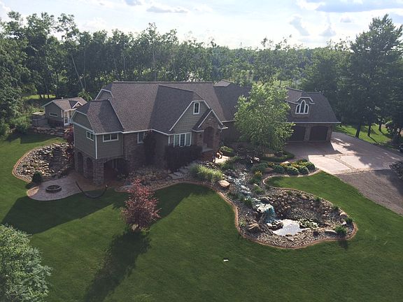 Custom built in 2007 with its own tropical oasis. The pool is 40x16 in ground fiberglass liner free, salt system for less maintenance with a custom 36' water slide big enough for the adults to enjoy as well. The pool has an added safety feature which the pool cover slides on tracks lined in the stamped concrete which fully encloses the pool and you can walk across it. There is a Pool House with a separate pump room for storage. The log pergola is by Percision Craft Log Homes that was custom built with a culture stone outdoor fireplace. There patio area is large with all exposed aggregate leading to the drive. The lawn has a sprinkler system with Rid O Rust water treatment. The landscape was professional installed with the ideal of low maintenance with three waterfalls. Theres a large pad of stamped concrete and exposed aggregate by the garage for parking. There is two pole barns one built in 2000, 100x60, all heated with nearly 2800 sq. office or second living quarters, AC and large deck and four large 14x14 bay doors. The other pole barn built in 2011 is 88x52 with two 13x14 large bay doors. The house has customer hand hewn hardwood flooring flowing though the main living, dining, kitchen and halls. Ceramic Tile in the foiler, laundry and bathrooms. The master bedroom has his and hers walk in closets with heated ceramic tile, large walk in shower with three shower heads and large Jacuzzi tub. The basement has a large bar made with Redwood and twisted juniper and a wine cellar. You can sit with your family and watch movies or TV in the theater. To help with your fitness theres a workout room which could be converted into a six bedroom with full wall mirrors on one wall. The utility room has plenty of storage area for holiday decorations and a zone furnace system to warm or cool section of the home separate.