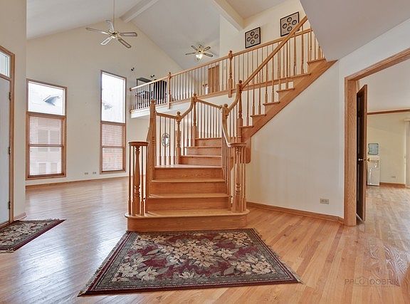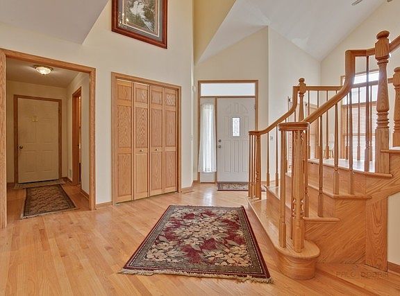 Welcome to this delightful home in The Village. This home greets you with an inviting front porch. As you walk in the front door, you will be captivated by the 2 sty entry, open and airy floor plan and loads of natural light streaming in. Gleaming hardwood floors and volume ceilings. Kitchen has recessed lights, oak cabinets with crown molding, granite counters, tile back splash, ss appliances, loads of counter space and breakfast bar off of the family rm. Fam rm has crown molding and brick fireplace.1st floor bedroom and full bath. 1st floor laundry with utility sink. 2nd floor has large master bedroom with hardwood floors and master bath retreat w/ jetted tub and separate shower. Bedrooms 2 & 3 share Jack n' Jill bathroom. Massive loft overlooks 2 sty foyer/liv room and can easily be converted to 5th bedroom. English basement waiting to be finished. Bring your ideas and make this house your home.