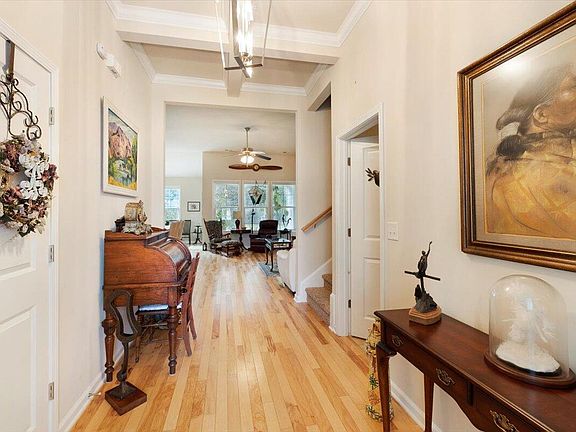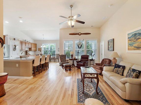Welcome home to your low-maintenance, single-story (plus bonus/FROG) dream home. Adorned with charming brick and Hardi-plank exterior that gives it much more character than many new homes. Upon entry, the beautiful hickory hardwood floors will immediately draw you in as well as wide foyer with custom tray ceiling detail the approx 12' ceilings in the living roo. The kitchen has a large island and dining area making this space open and cohesive and great for entertaining and allowing natural light in. The owner's suite provides views of the fenced back yard and has an large en-suite bathroom and large walk-in closet. Two additional bedrooms are on the first floor and share a hall bathroom and there is a two-car garage and screened porch. Paid off solar panels!!!