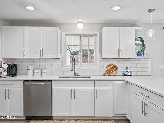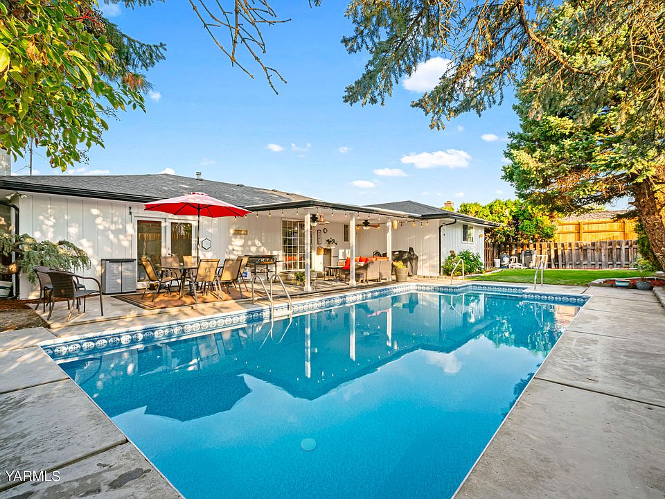 Beautifully updated home that features a backyard Oasis! The inground pool is heated, with a new gas heater and just a couple year old liner. The interior of the home has an open concept with a large kitchen that has newer white cabinets, nice stainless appliances, and tons of white Quartz counter space that includes a peninsula with seating. The Living room has a gas fireplace and French doors that lead to the the pool area. The Primary bedroom is separate from the other two bedrooms. When you pull up you will see new paint and a newer roof. You'll see RV Parking on the side of the house as well as ample street parking. Call your REALTOR of choice today to set up a showing.