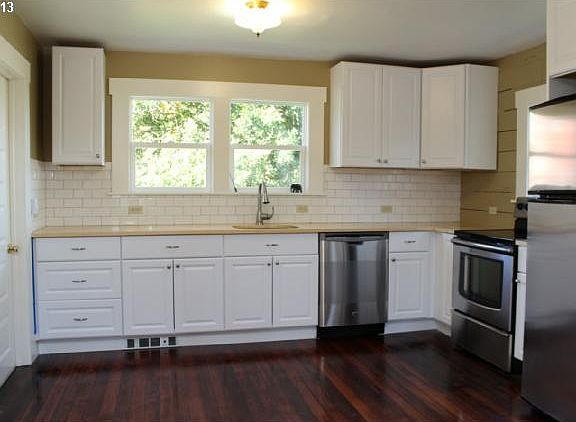 Move-in ready Bungalow Farmhouse features NEW roof & gutters, NEW Kitchen w/stainless appls, subway tile & solid maple counters, NEW tiled bath, refinished fir flrs, wrap-around cover porch and more. 3 bedrooms + views of Berrydale Park & Mt. Hood! A great value in a quiet neighborhood.