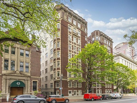 The Historic Ambassador Condominiums is a National Historic Landmark building designed by Architect Carl Linde in 1922. Known for its elegant Jacobean architecture, coupled with steel-reinforced concrete construction, it has been one of Portland's most prestigious addresses for over a century. Unit 503, is a light-filled NW corner unit with newer double-paned windows on THREE sides of the unit. The seller upgraded the windows to double-pane, with historically accurate French panes, which bathes the interiors in natural light as well as capture views of the Historic Architecture surrounding the building. Only one wall is shared with a neighbor, combined with the steel & concrete construction, which means this is an incredibly private condominium. Unit 503 retains the original high-style architectural details including oak hardwood floors, extra tall base moldings, 9-foot ceilings trimmed with stacked crown molding, & extensive built-ins. The kitchen received a slight refresh with a sleek glass-top induction cooktop & newer lower cabinets. The primary bedroom boasts an en-suite bath. A full bath in the hall serves the other two bedrooms. Leave the car in the secure, off-street space, which is a leased space for $250/Mo. Heat & hot water are included in the monthly dues, as well as garbage, water, sewer,& reserves. The adjacent parking lot has leased parking spaces exclusively to Ambassador residents since the building was converted to condominiums. Residents enjoy a rooftop deck with 360-degree views of downtown & lushly appointed guest suite with a full, private bathroom. The large recently updated laundry is located in the lower level of bldg. The cap for in unit washer/dryers has been met. The location is tops for Cosmopolitan living with easy access to cultural landmarks like the Portland Art Museum & Arlene Schnitzer Concert Hall. With a Walk Score of 99 & proximity to public transit, the Ambassador offers unparalleled urban convenience in a historic setting.