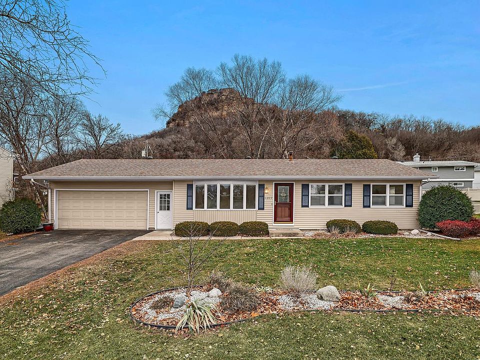 Delightful 3-bed, 2-bath ranch with attached 2-car garage nestled at the base of the breathtaking bluffs. Only two owners since its construction, this home offers classic features & picturesque location. Inside, you'll find beautiful bay windows + wood floors that add warmth and character throughout the main living areas. Kitchen has all new appliances, combining functionality with modern convenience. Lower level presents a blank slate, ready for your personal touch to the living space. Outdoors enjoy bluff views from the patio w/ pergola while keeping an eye on your garden beds once summer rolls around! Radon mitigation system is already in place for added peace of mind.