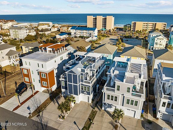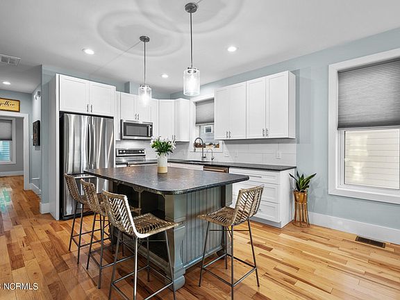 Located in the Heart of Carolina Beach, two blocks back from the famous Ocean Grill and Tiki bar, sits this gorgeous 4 Bedroom, 3.5 bath townhome, ready to go, just in time for Summer! Made for entertaining, this home features plenty of outdoor space, including an expansive rooftop deck with ocean views! Listen to the live music on Thursday nights playing from the tiki bar and watch the fireworks from the boardwalk without ever leaving your home! With over 2,200 SF of living space indoors, this 3 level, contemporary home has plenty of room to spread out. On the main level, you will find 2 bedrooms and a full bath. Take the elevator up to the second floor, which includes your primary bedroom with its ensuite bath complete with a double vanity and custom tiled shower. Also on this floor you will find your large, open concept living room and kitchen. Features include 9' ceilings, large windows, which pour in natural light. The kitchen features solid surface counters, a large island for extra seating and prep space and all stainless steel appliances. On the 3rd level, you have a 4th bedroom and full bath which can also used be as a flex room, office space or guest quarters. Also included on this level is a wet bar with a wine cooler. Listen to the ocean on your back screened in porch, which includes a custom daybed swing! Also included with this home is a garage with plenty of space to store your beach gear, a private outdoor shower and private fenced in back yard with updated hardscaping. Located on a quiet street, just minutes from everything CB has to offer, this one you must see to truly appreciate!
