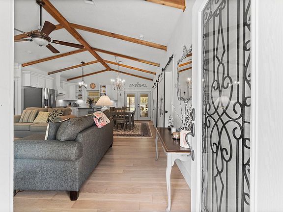 You will discover an exceptional property as soon as you drive through the entrance gate of this property. It has it all including a beautiful French Country themed home offering split floor plan, open living, dining and kitchen area. Sunroom offers sitting area, Hot Springs hot tub, & mini split CAH. Also, three-bay attached garage with lots of storage, water well, water filtration system, 20KW generator, tankless water heater, and two 1,000-gallon inground propane tanks are just a few of the extras! The expanse front porch offers a sitting area, and massive outdoor fireplace. The fenced yard creates a great place to entertain with a 25,000 gallon in ground pool with stone coping, artificial turf, gazebo, and putting green. The detached barn has a guest house and full bath, workout room, with padded floors, tack room, workshop, sink, two horse stalls with fans, concrete floors and adjoining paddock. Pond with pier, 6-hole golf course & driving range, pistol range and shooters table.