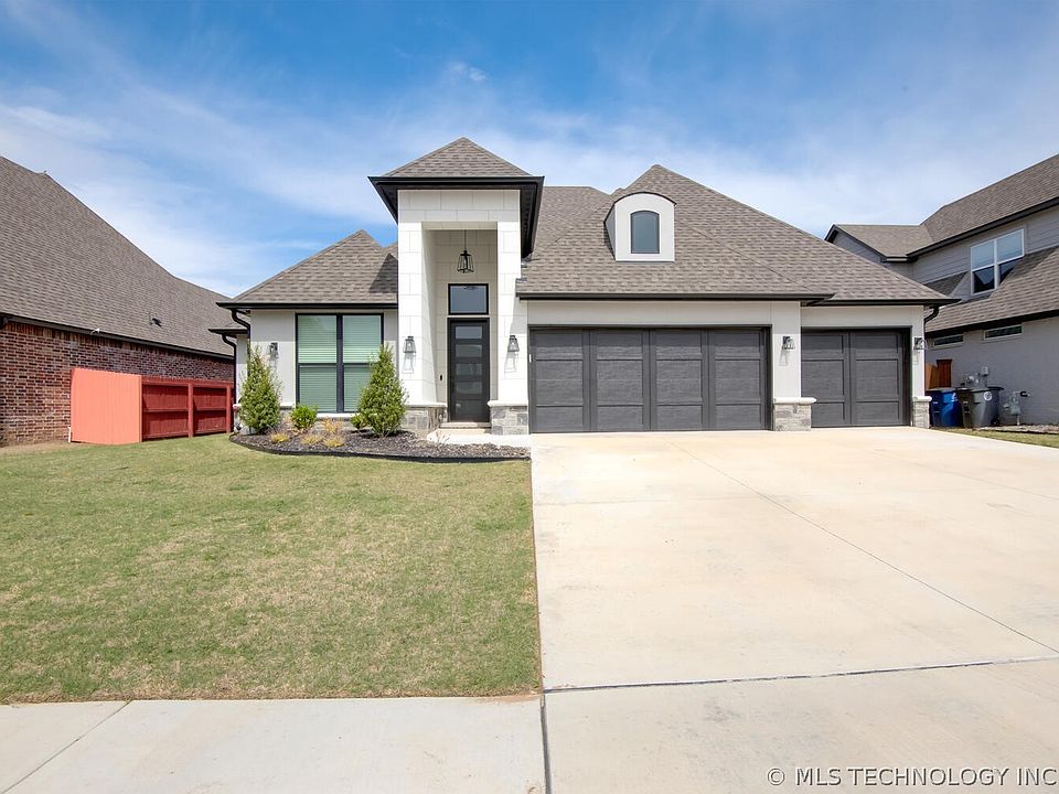You do not want to miss this pristine property! This never-lived-in three-bedroom home plus office (with closet and window) is ready for you. Built in 2022, this property boasts luxurious wood floors, floor to ceiling stone faced fireplace and vaulted ceilings accentuating its spacious floorplan. Discover convenience at its finest with a primary bedroom closet that opens to the laundry room, complemented by custom built-ins in the living room for added functionality. The gourmet kitchen is a chef's delight, complete with a walk-in pantry, gas stove, beautiful granite countertops and cabinetry complete with lighting. The drop zone located just inside the door from garage is perfect for organization. Outside you will find a covered patio that overlooks the serene community pool, offering the ideal setting for relaxation and entertainment. Less than 2 miles from Tulsa Hills shopping/restaurants!
