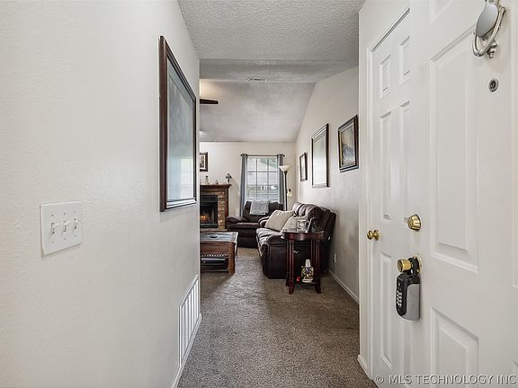 Cute as a button!! Three bedroom, 2 full baths situated on a corner lot in a well established neighborhood with mature trees. Charming covered front porch and newly painted exterior boast excellent curb appeal! Cozy vaulted living room with wood burning fireplace and vaulted ceilings. Kitchen has been updated with newer appliances and can lighting. Breakfast nook has double bay window for lots of space and natural light. Newer carpet and paint throughout the interior. Bedrooms are spacious with walk in closets. Hall bath has been recently updated with new paint/fixtures/vanity/tile. Oversized primary with private bath that has his and her closets and new double vanity. Garage is big enough to accommodate a large truck. Spacious back yard with newer privacy fence and brand new storage shed. All of this situated in close proximity to Broken Arrow's Warren Theater, shopping, and restaurants with easy access to the Creek Turnpike!