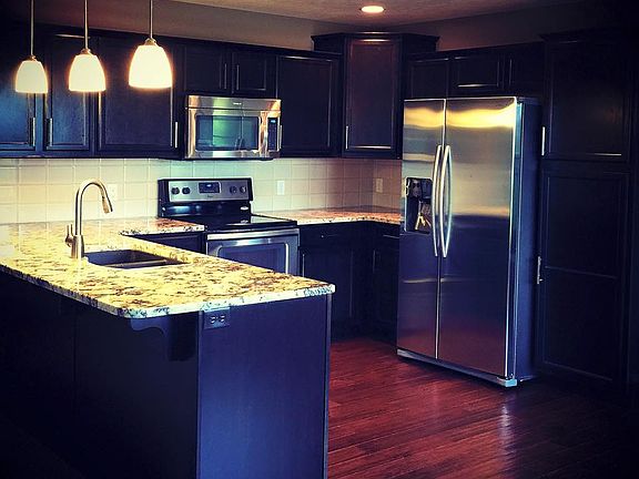 New home offering a large vaulted living room with gas fireplace opening into the kitchen. Kitchen offers wood floors, tile backsplash, and plenty of cabinet and countertop space. Situated on a corner lot and backs to a field. Contact Megan Goth at 660.351.2978