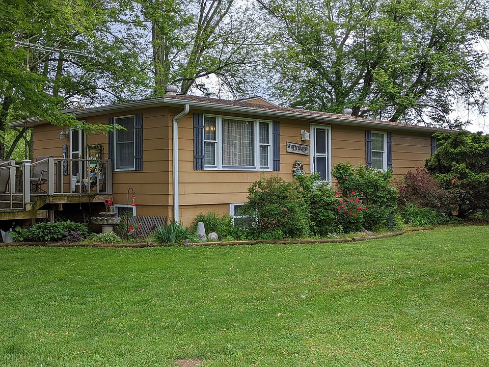 The landscaping around this property is outstanding for gardeners. Lots of trees and just outside of city limits for this 3 BR, 1.5 bath home with full basement. Added family room gives additional living space with fireplace and French doors to deck, along with a side deck of vinyl composite, a gardening shed and 40'x60' pole barn/garage. All appliances remain.