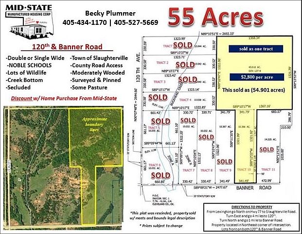 120TH & BANNER ROAD Only 1, 55 Acre Tract Remaining!! Lots of wildlife, secluded, surveyed & pinned, tracts with pasture, moderately wooded, county road access. Town of Slaughterville, is a stones throw from HWY 9 and makes for an easy commute into Norman and OKC. Country living with close proximity to schools, work and shopping! Directions: From Lexington go North on HWY 77 to Slaughterville Road. Turn East and go 4 miles to 120th. Turn North and go 1 mile to Banner Road. Property located in Northeast corner of intersection. At this price it's a great deal with our Land prices soaring! A steal of a deal at 2,800 per acre, you get all 55 for only $152,000