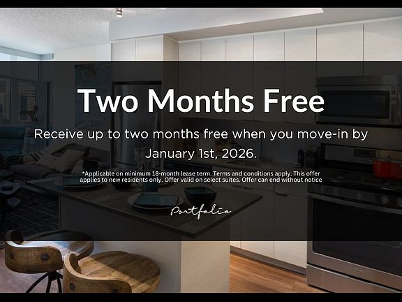 - Special offer! Two Months Free - Receive up to two months free when you move-in by January 1st, 2026. *Applicable on minimum 18-month lease term. Terms and conditions apply. This offer applies to new residents only. Offer valid on select suites. Offer can end without notice