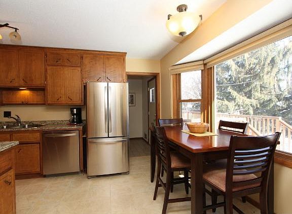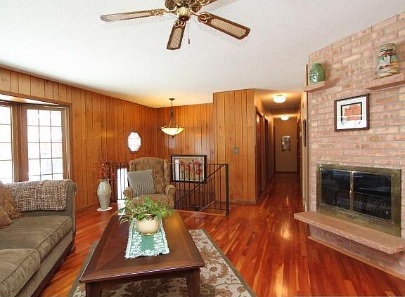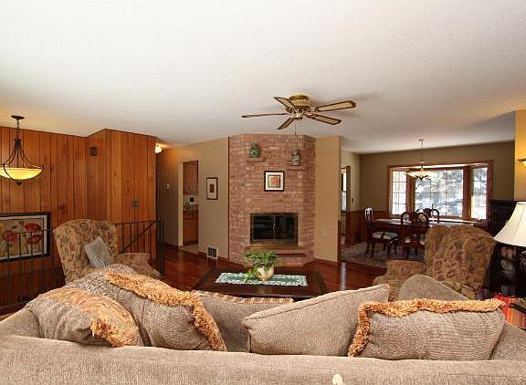 Timeless neutral decor -3 large BR on main level. Bath has cultured marble. Hdwd, tile & ceramic flrs. Ample closet/storage. Updated eat-in kitch. DR w/built in cabinet. 2 bay windows in DR & LR. 2 wood fireplaces. 2 tier deck. Main floor laundry.