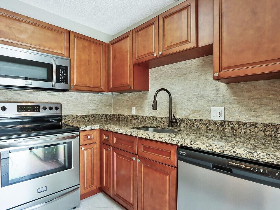 Beautifully RENOVATED 3br in waterfront building, only one unit from the largest lake in Glenwood. Fenced private courtyard entry. Kitchen with stainless steel appliances, granite countertops & stone backsplash. Luxury laminate flooring upstairs, tile downstairs, no carpet. Oversized primary bedroom with 2 closets, including a large walk-in. 1st fl bedroom/den/office has a closet. Updated bathrooms, with a brand new vanity in the primary bath. Accordion hurricane shutters for peace of mind during storms. Quiet location, set back from the parking lot & away from the Turnpike. 2 assigned parking spaces in front of the unit. PGA National 24/7 manned security gates & roving patrols. Glenwood features scenic nature trails, lakes, pool, playground, basketball, pickleball & tennis.