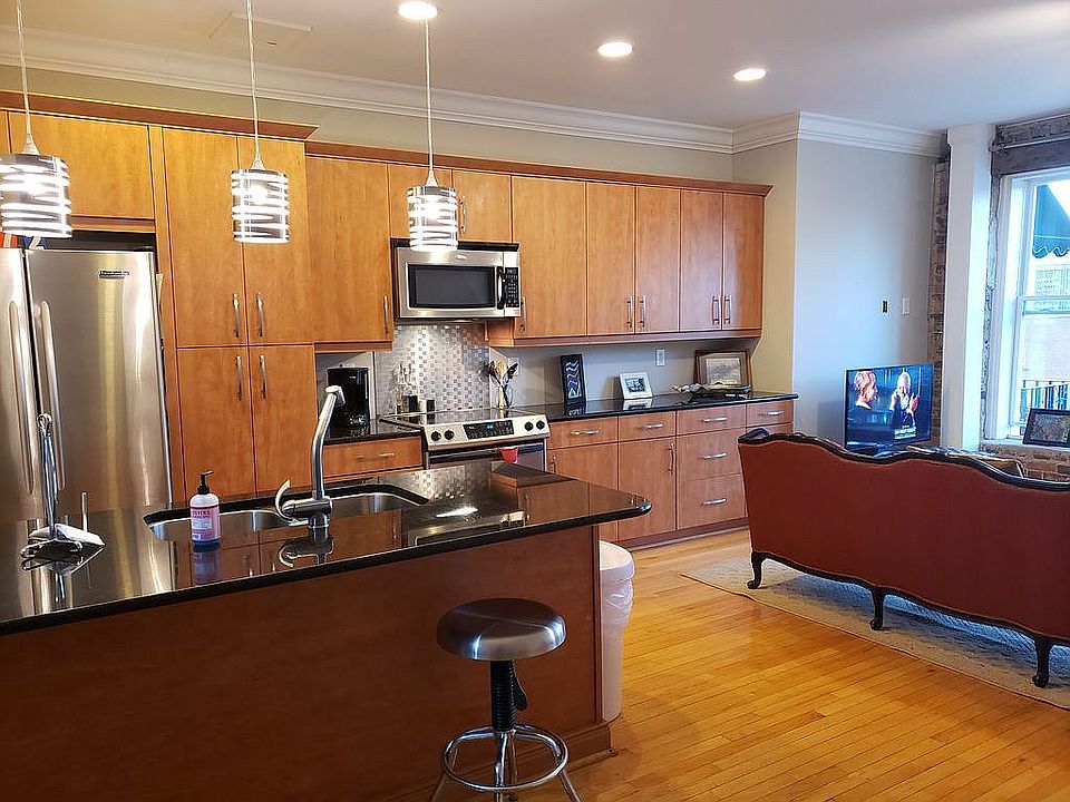 There are other places for sale in downtown Greensboro but no other one has this view or location. Amazing views and perfect location. There are 4 penthouse style lofts facing North between Elm street and Green street. This spacious home has the perfect city view. You can see the time and temperature located at the top of the Lincoln Center building from each room. It features an open floorplan with hardwood floors, the bathrooms are tile, and carpeted bedrooms. The walls are freshly painted and ready for new owners.High ceilings with too many design features to list. Large Master bedroom features walk-in closets and stand up glass shower with a jacuzzi tub. Large double vanity with granite countertops. This place has the brick exposed throughout the house. It features a large back deck and private courtyard for grilling and socials.